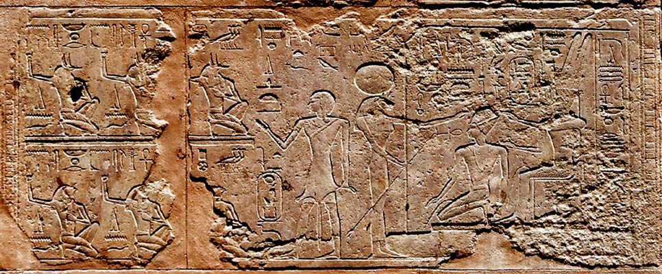 Assise 5 : la figure de la reine a été ici complétement martelée. A gauche, la scène représente la course rituelle et à droite, l'accolade.