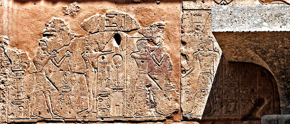 Assise 9 : A gauche, le roi offre deux vases d'eau à Amon-Min. A droite, Thoutmosis II offre de l'encens à Amon.