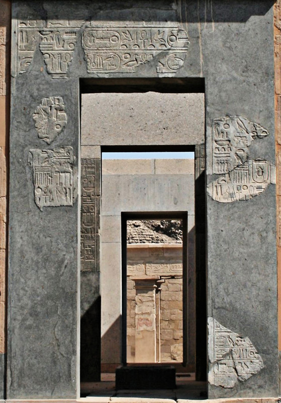 Sur la porte en diorite, réalisée par Thoutmosis III., le roi devait être représenté de chaque côté tourné vers la porte. Sur le linteau, en première ligne, un disque ailé avec ses épithètes habituels de chaque côté et en dessous, la titulature de Thoutmosis III.