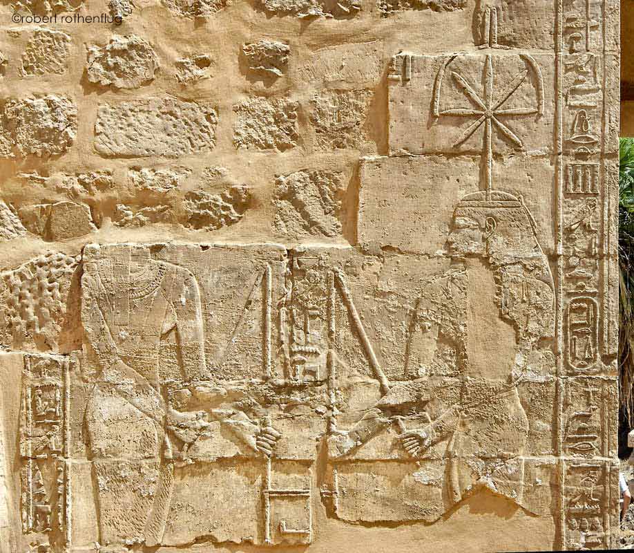 Cette scène se trouve sur l'envers de la façade du côté Ouest. La divine adoratrice Amenardis I et la déesse Sefekhet-Âbouy enfoncent chacune un pieu dans le sol autour desquels le cordeau va s'enrouler pour délimiter l'emplacement du temple. À droite, une des inscriptions entourant la porte concerne la divine adoratrice.