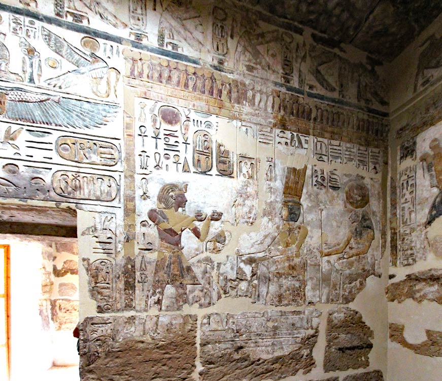 À gauche, la porte entre les chapelles VI et VII et à droite, la scène d'offrande avec Ramsès II, Onouris et Tefnout.
