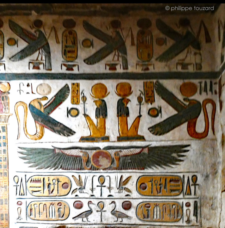 En dessous le disque ailé, les titulatures de Ramsès III: