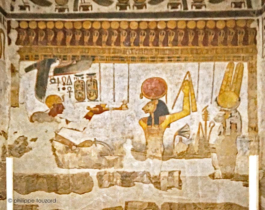 Ramsès III offre de l'onguent présenté par un petit sphinx royal à Atoum avec une déesse.