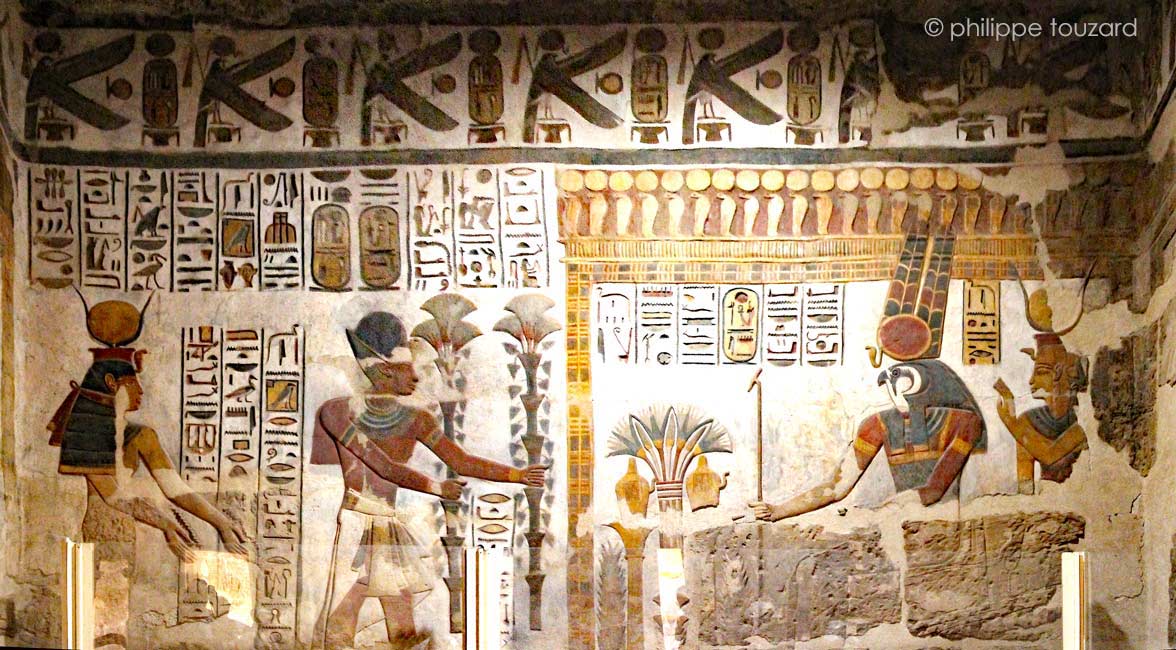 Le roi offre un bouquet de fleurs au dieu Montou, le maître de la puissance accompagné de sa parédre Rattaiuy.