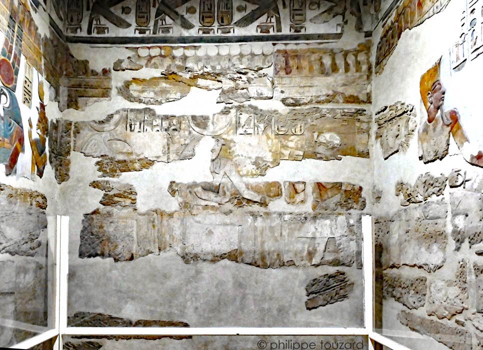 Au dessus de la porte, au registre du haut, Nekhbet à gauche et Ouadjet à droite