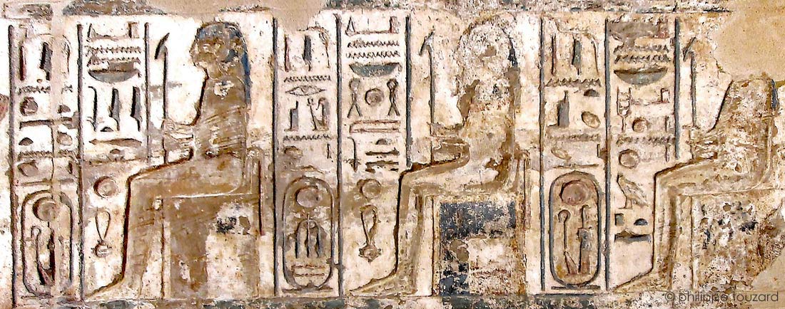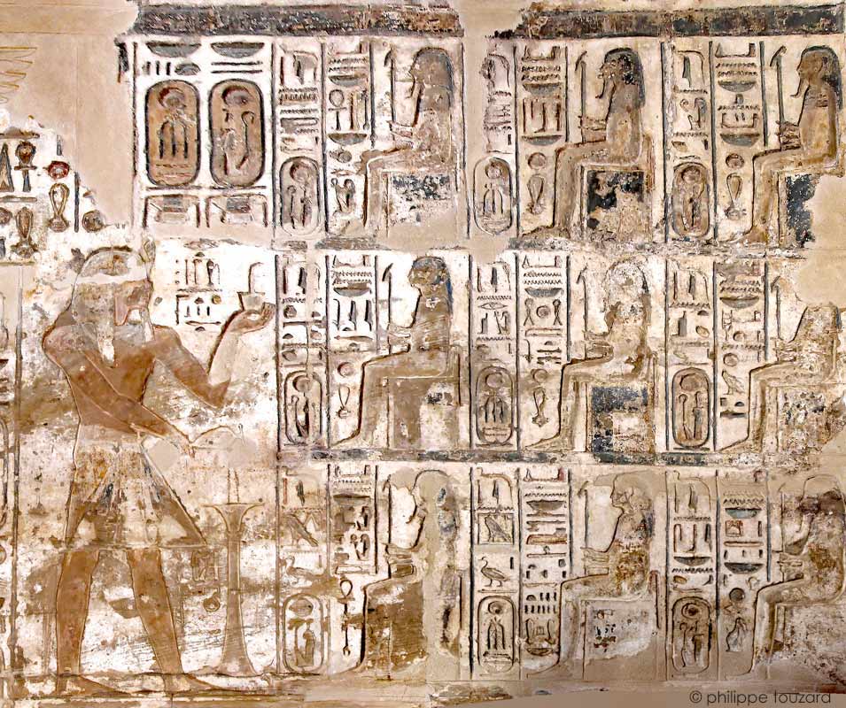 Ramsès III fumigène de l'endens devant la Grande Ennéade thèbaine conduite paar Montou.