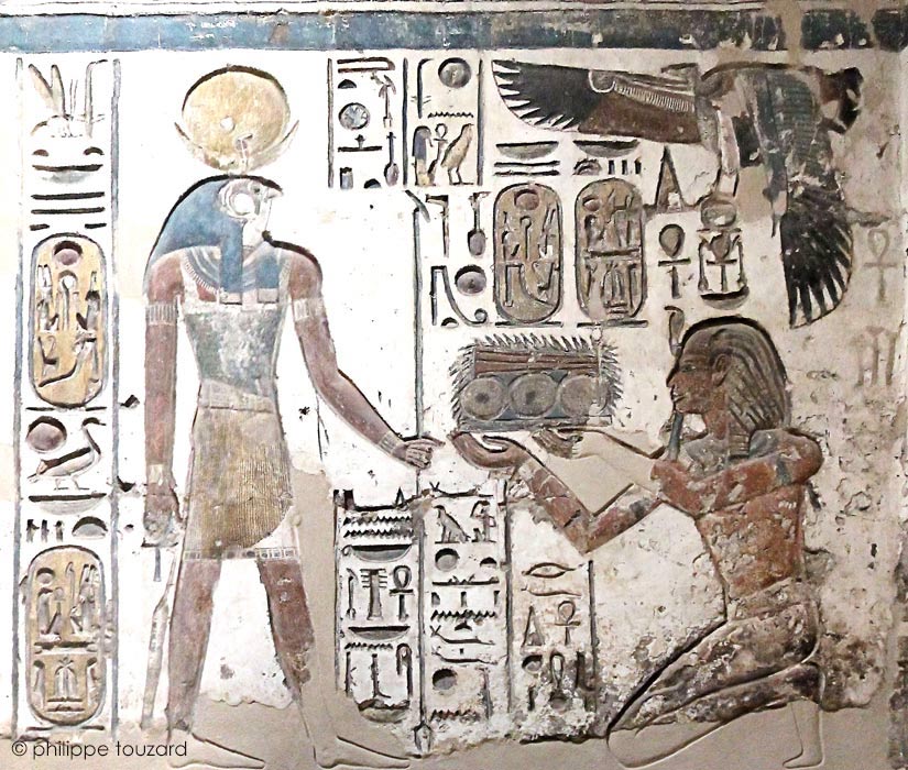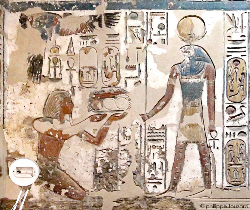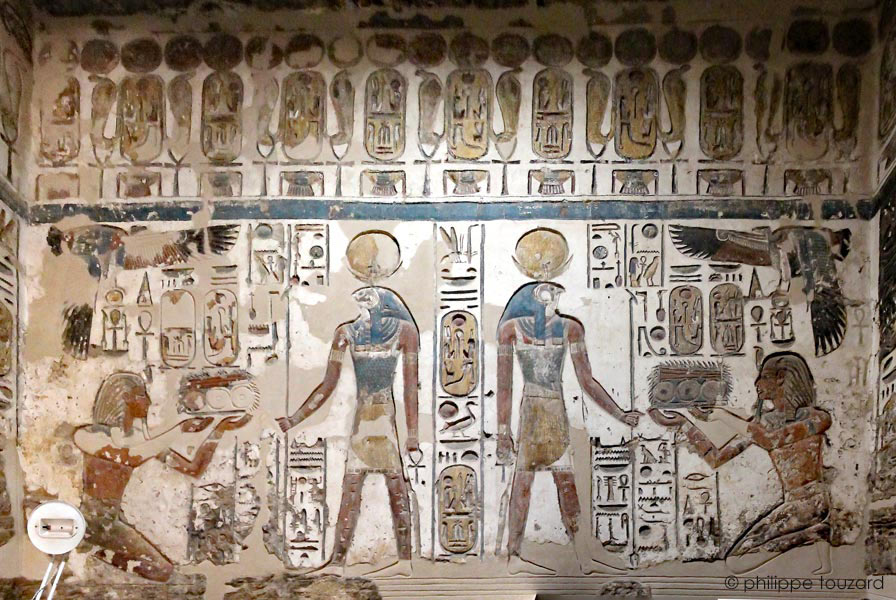 Les paroi du fond sont décorées de scènes doubles vers lesquelles les rois des deux côtés sont tournés.(détails des scènes ci-dessous).