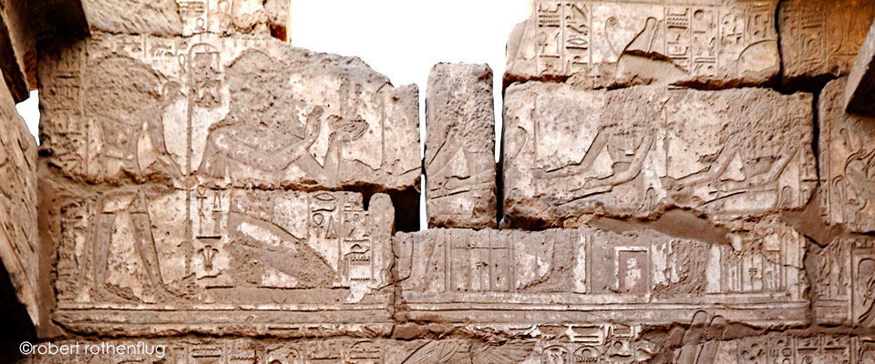 Ramsès XI donne un bouquet de fleurs à son père Amon-Rê en présence de Khonsou. Amon-Rê lui donne tout pays en paix, toute vie et puissance comme Rê.(OIP 103 : pl.186)