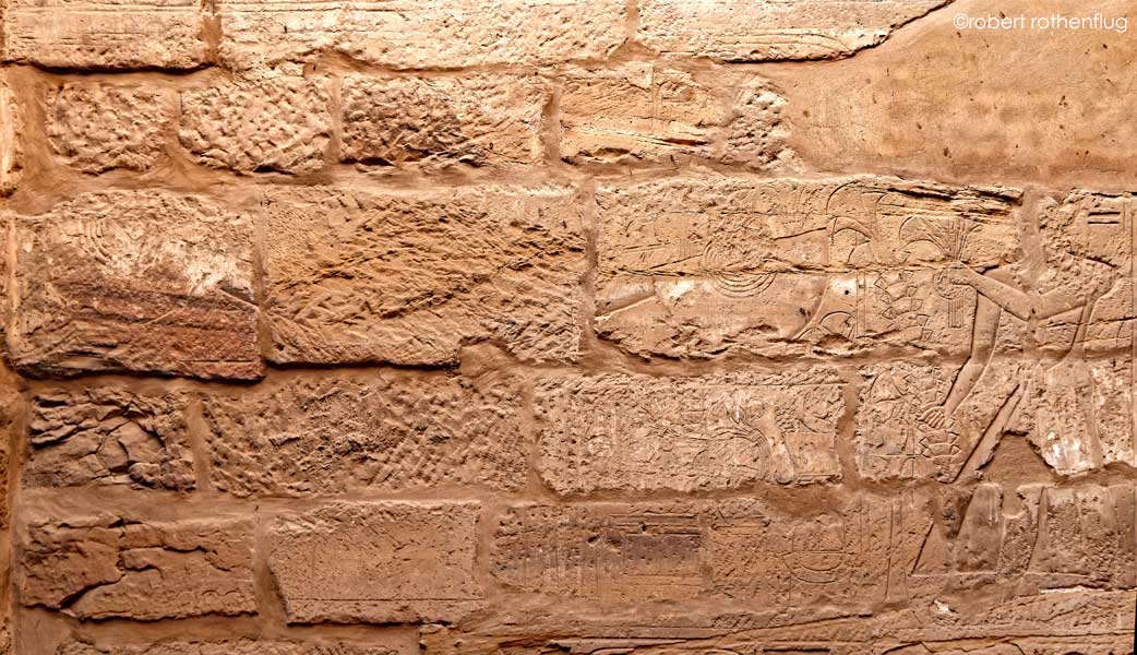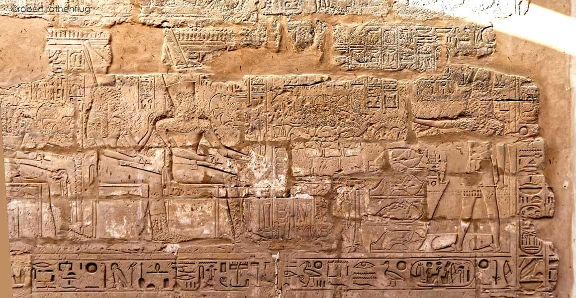 Ransès XI , le seigneur des Deux Terres, consacre une grande offrande de cuissots de bœufs à Amon-Rê accompagné de Mout et de Khonsou, formant la Triade Thébaine. Amon-Rê, prééminent dans Karnak, annonce que son cœu est rempli d"amour pour le roi. Mout est la maîtresse d'Ichérou (son domaine à Karnak), œil de Rê, Khonsou de Thèbes, Neferhotep,le grand dieu qui réside à Karnak, donne au roi la durée de