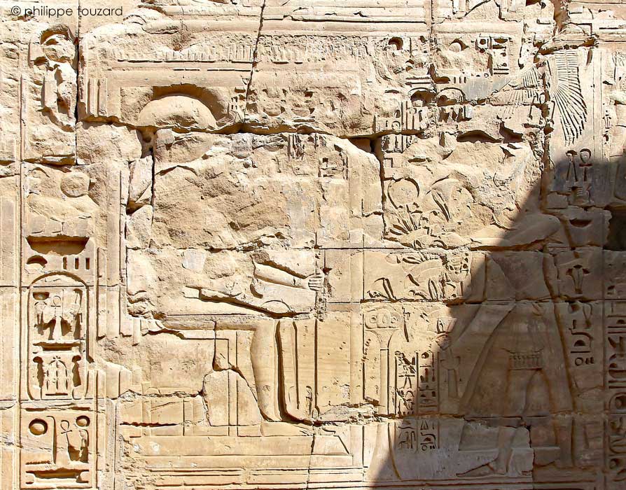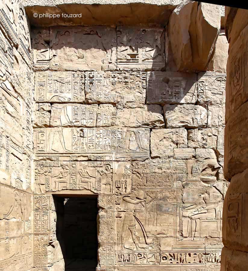 Dans une scène symétrique du côté est, le roi Ramsès IV offre des fleurs à Khonsou.