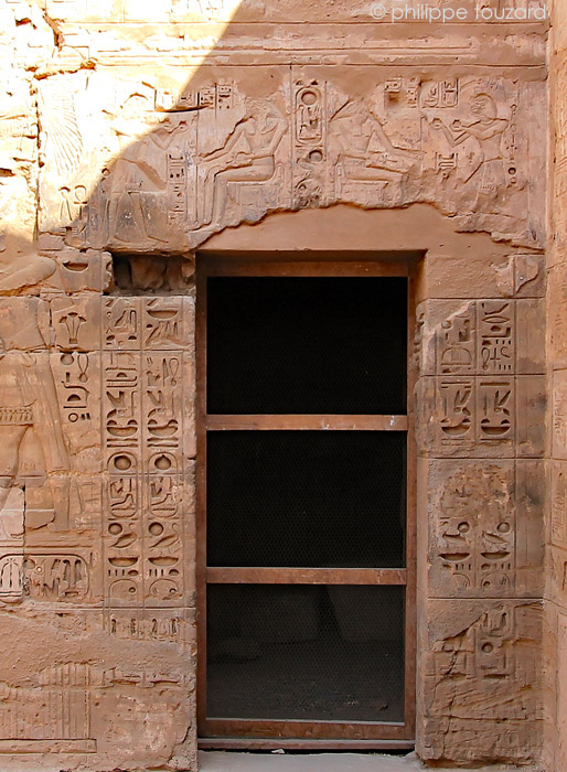 Sur le linteau, dans une double scène, Ramsès IV offre du vin à Khonsou. Les montants sont couverts des titulatures royales. À l'intérieur, Ramsès IV officie.