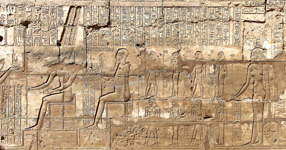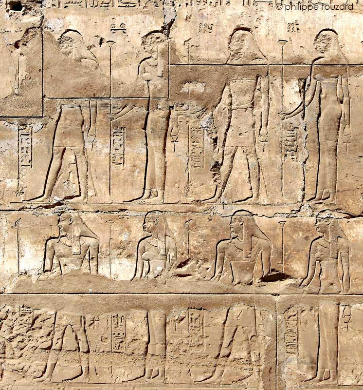 Sur le registre du haut, à droite, le roi fumigène de l'encens devant Ptah.