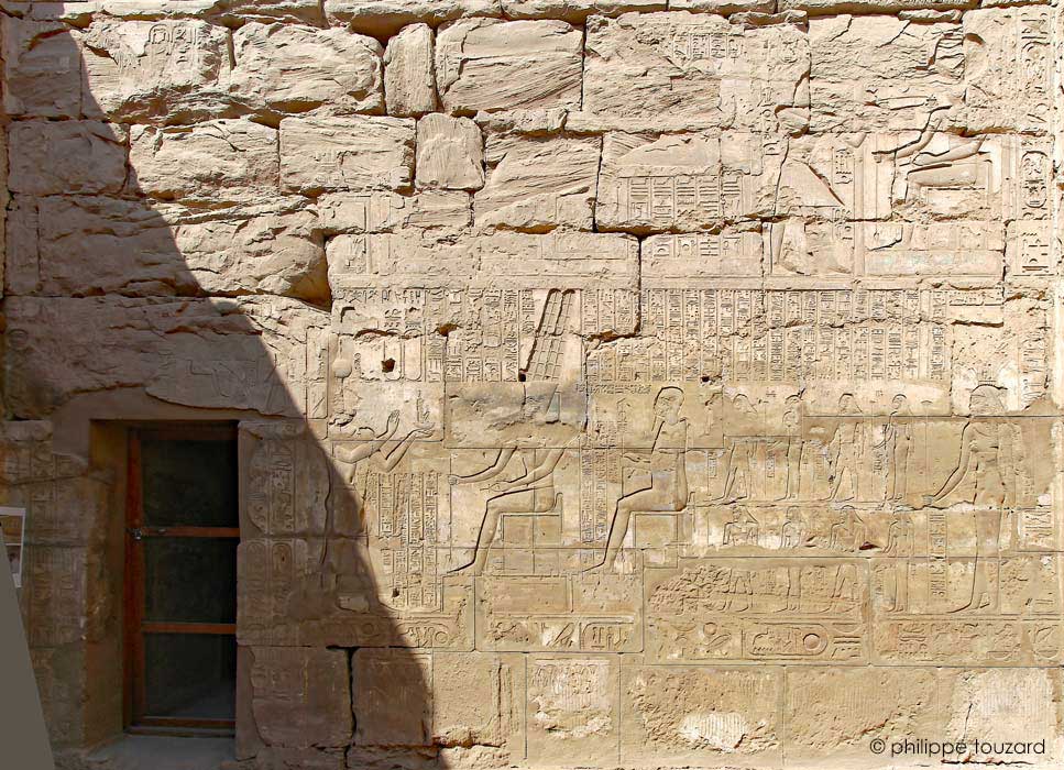 À droite, une grande scène d'offrande de la Maât aux dieux effectué^par un roi dont les cartouches sont restés vierges.