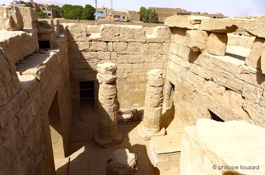 Les 4 colonnes entourent le reposoir dont les 4 faces sont discutées dans la page suivante. Les scènes dans l'ombre sont plus difficilement lisibles. En haut de la paroi Est, ici en face, le roi Ramsès IV ptése,nte des offrandes devant la barque de Khonsou posée sur un reposoir (non présentée en détail).