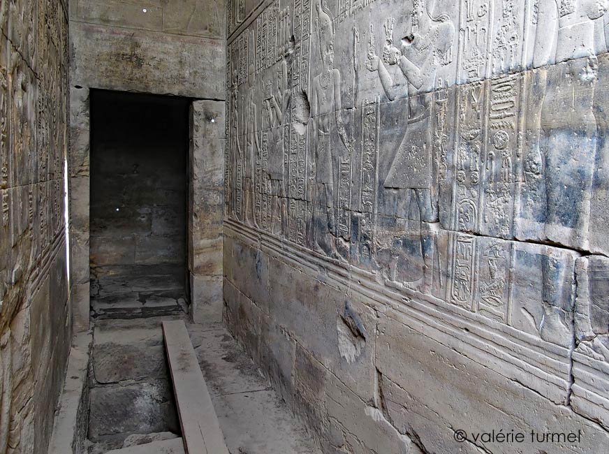 La paroi Sud de cette partie du couloir comprend 6 tableaux. Deux scènes du registre du bas se devinent à droite. Au fond, le roi Ptolémée Évergète II offre le pectoral oudjaou à Montou et RRâttaouy. À côté, il offre le Sud et le Nord à Osiris.