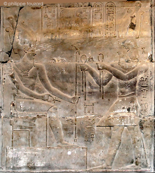 Le roi Ptolémée Évergète II présente la Maât en offrande à Osiris (Ounennefer juste-de-voix)I roi des dieux, lumière du temple d'Opet, grand dieu maître du ciel. Osiris donne au roi le vent dans sa narine pour qu'il respire.