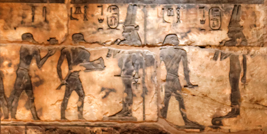 Rituel d'ouverture de la bouche avec une herminette terminée par une tête tenue par le prêtre Sem.