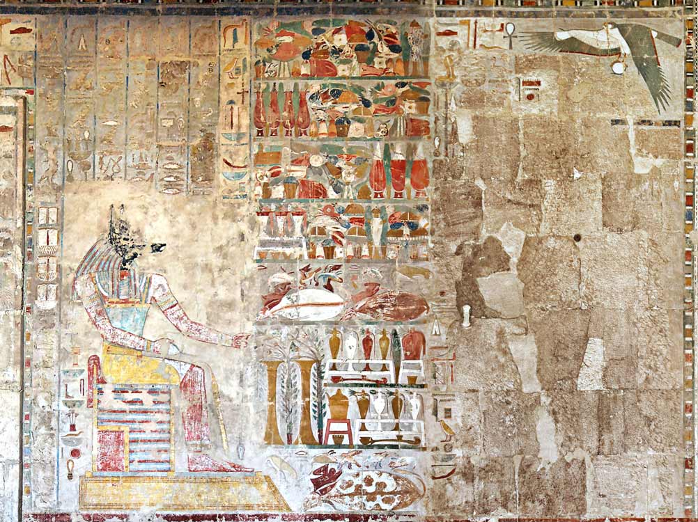 A droite du sanctuaire, Anubis reçoit les offrandes posées sur plusieurs niveaux. La reine (dont l'image n'existe plus à droite) les lui présente. Des inscriptions ont également été abîmées.