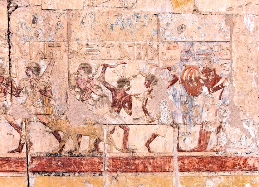 Un soldat tient en laisse des félins. Derrière lui, des Lybiens dansent, un baton de jet à la main.. Les autres Lybiens battent la cadence avec leurs batons de jet.