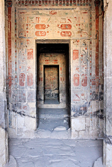 Il était seulement possible de voir les portes en enfilade. On peut remarquer que dans l'expression 'Aimée d’Hathor, le participe est au féminin alors que le cartouche est celui de Thoutmosis II. Dans le fond, Hatchepsout est amenée vers Amon par Hathor (planche 106 de Naville).