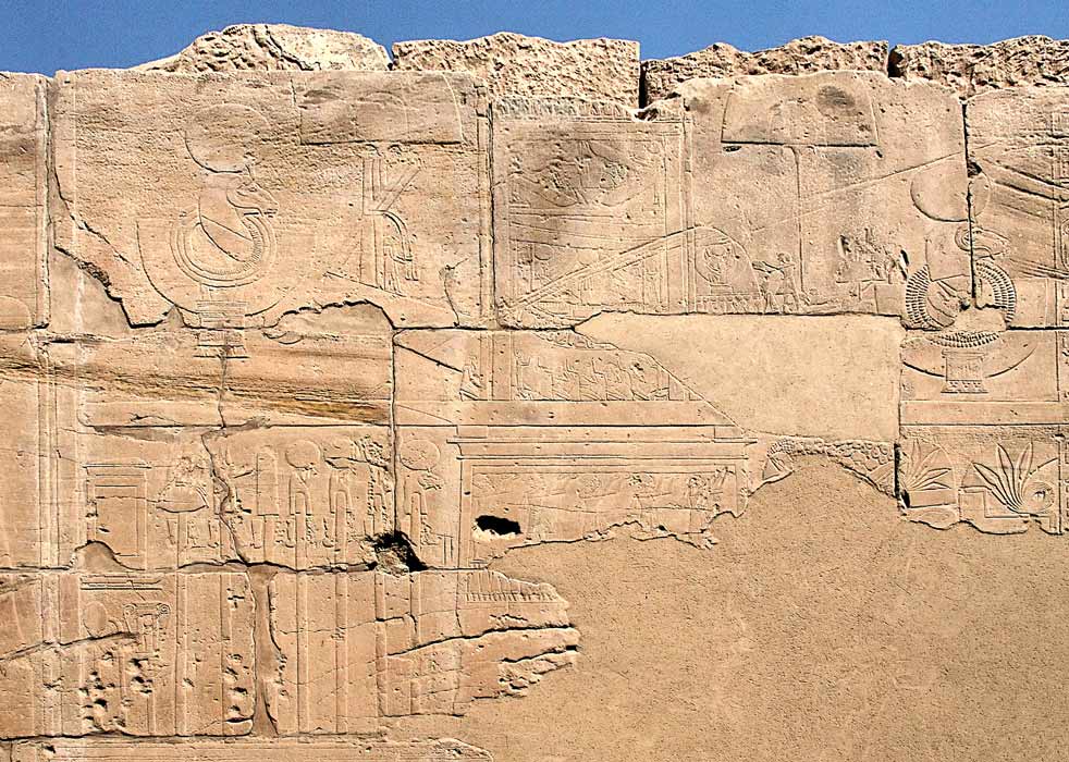 Sur le naos, deux déesses ailées, sans doute Isis et Nephtys, protègent de leurs ailes deux divinités dont on distingue mal les contours : probablement Osiris en haut et peut-être Horus en bas. Devant le naos, la Maât(?) semble porter un disque solaire avec deux uraeus. En bas du naos, les âmes (baou) de Pe chantent les louanges du roi encadrés par deux petites déesses les bras levés et montées sur des signes représentant l'or.