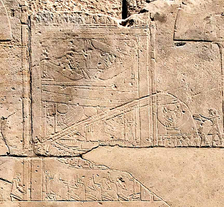 La barque d'Amon ressemble comme deux gouttes d'a=eau à celle gravée dans le sanctuaire de cette barque (salle XIII).. On y retrouve les mêmes personnages à l'avant du bateau. En dessous, de petits pharaons soutiennent le ciel. Dessous l'arrière, les enseignes habituelles avec Amon en tête. Sous le naos, les baou de Pe (ville de Bouto) acclament le roi. Ces personnages soit des baou des rois prédynastiques, soit d'anciennes divinités. (Corteggiani,