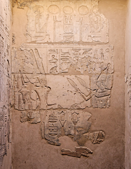 Au fond, le roi offre des laitues à Amon Kamoutef. Les laitues sont le symbole de la régénération. Les scènes sont gravées en relief dans le creux. |