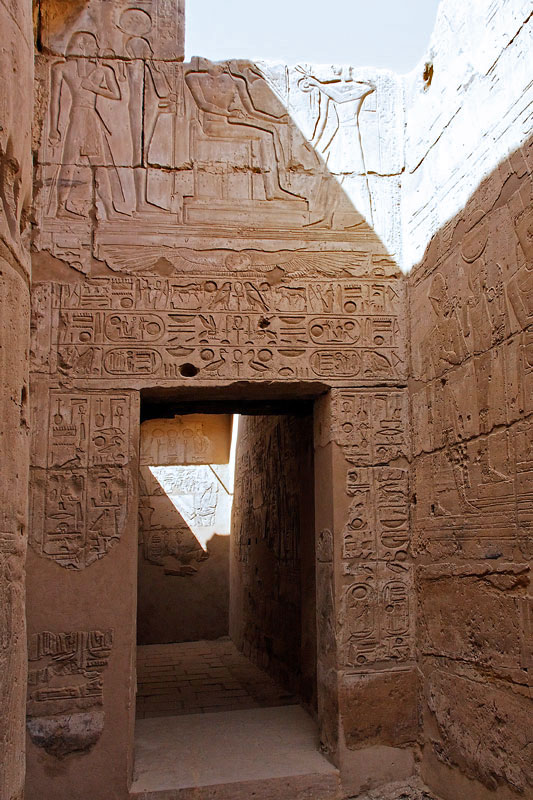 L'entrée de la chapelle XXXI se trouve sur le mur en face de l'entrée de la chapelle XXVIII (mur ouest). En haut, Ramsès II offre des fleurs à Amon, Khonsou et Sethy. Le relief est encreux et la forme courte du prénom de Ramsès est utulisée, donnant comme date le cours de la 2ème année du règne de Ramsès II. Autour de la porte, les cartouches sont de Ramsès II.