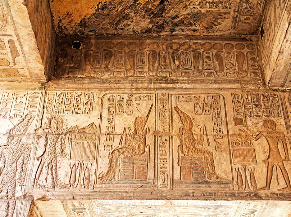 | Sur le mur côté porte (mur est), seule la frise du haut est en bas relief. Pour les autres scènes, la technique est celle du relief en creux. Sur la frise, sont juxtaposés les cartouches de Ramsès I, Sethy 1er et Ramsès II. Au dessus de la porte, sont gravées deux scènes symétriques où Ramsès II, en tant que prêtre Iounmoutef, consacre des offrandes à Ramsès I. Ce dernier, montré comme momiforme, porte la Couronne Rouge à gauche et la Couronne blanche à droite. Au milieu, est inscrit un texte décrivant le travail de Ramsès II pour le ré-aménagement du monument construit pour son grand-père par son père Men-Maât-Rê. L'utilisation du prénom long pour Ramsès II indique que ces scènes ont été gravées après la 2ème année de règne. (Brand, 1998) |
