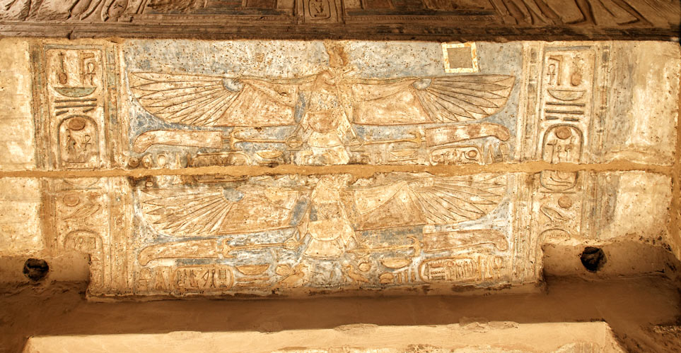 Les deux vautours sont encadrés par les titulatures de Sethy à gauche et de Ramsès II à droite. Le panneau a été creusé des 2 côtés pour les axes des panneaux de fermeture.