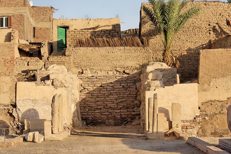 Sur les restes des parois du passage au milieu du pylône, quelques écritures et décorations subsistent. On peut reconnaître les cartouches avec les noms de Sethy.