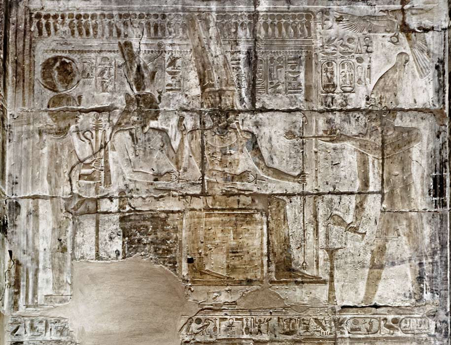 | Paroi dsu fond : dans une scène déjà représentée sur les murs de la salle hypostyle, Sethy encense la Triade Thébaine et lui verse une libation. Ici Khonsou est debout derrière Amon et Mout. |