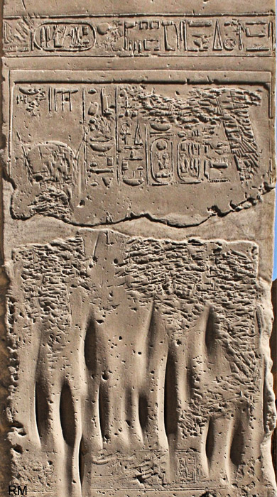 Pilier A, face vers l'est : sur la scène du milieu, Sethy est agenouillé devant Amon avec une offrande dans les mains. Autour du pilier, les titulatures de Sethy..