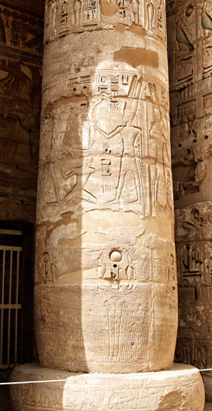 Toutes les 8 colonnes sont décorées des mêmes scènes : devant un dieu, Amon-Rê en général, le roi fait le geste de massacrer les ennemis de l'Egypte.