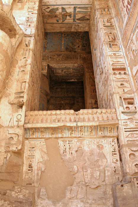 Le côté ouest (à gauche) est séparé du côté nord (à droite) par un portique comprenant un mur écran surmonté d'un pilastre et fermé par un pilier carré. Sur ce pilier, un reste de statue osiriaque du roi.