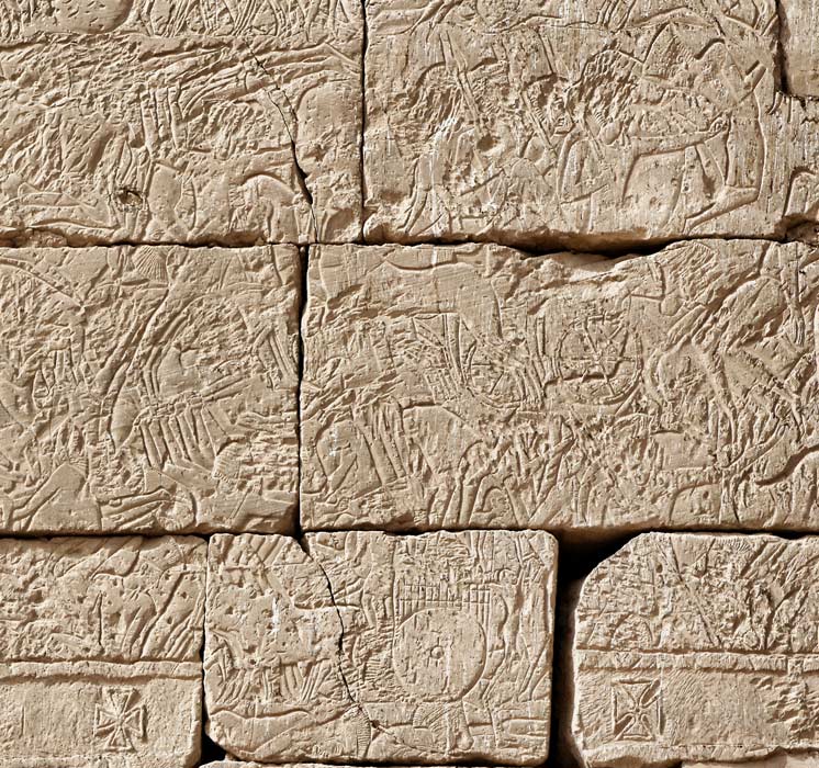 Au milieu des combats qui font rage, ont été représentés des boeufs à bosse tirant des charrettes. Les Peuples de la Mer se déplaçaient avec leurs tribus entières, femmes et enfants. On peut d'ailleurs deviner les silhouettes de personnages plus petits que les combattants, femmes ou enfants sur le chariot ou derrière. En haut à droite, des combattant ennemis font leur soumission. Les visages ont été martelés, sans doute par les premiers chrétiens.