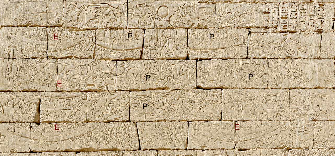 Les navires égyptiens (marqués E) engagent la bataille contre les navires des Peuples de la Mer (P). Les archers et les frondeurs font pleuvoir sur les ennemis une grêle de traits. Un des bateaux ennemis (à droite) s'échoue et ses occupants sont précipités à terre. Un autre a chaviré. A droite, en bas, un soldat égyptien tire à terre un soldat ennemi (d'après P. Grandet, page 200).