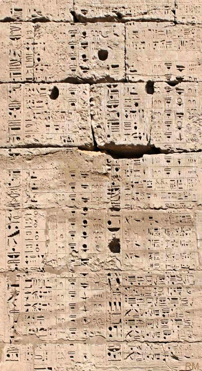 La porte la plus près du 2ème pylône était utilisée également par Ramsès III pour accéder à la cour et y recevoir l'hommage de ses fils qui lui apportaient des bouquets. Au dessus, le calendrier de certaines fêtes agrandi ci-contre. Encore au dessus, la fin des petites scènes vac la scène concernant Sobek-Rê qui est la plus proche du pylône.
