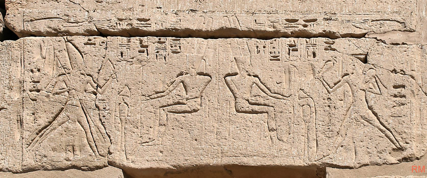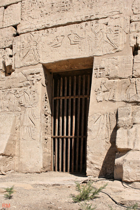 Le linteau de la porte montre 2 scènes symétriques de la course rituelle du roi vers Amon : à droite avec des vases, à gauche avec la rame et le flagellum.