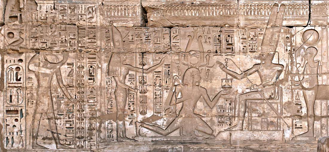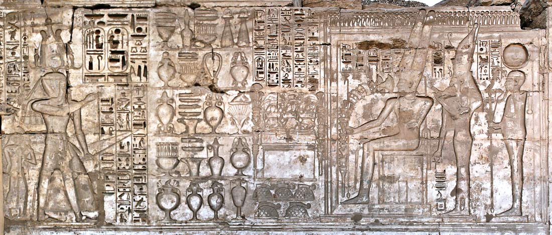 Le roi porte la couronne Atef. Cette scène se trouve à l'est de l'entrée dans les salles du trésor fermées à la visite.