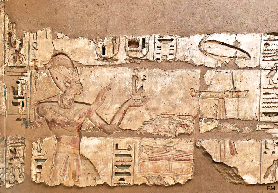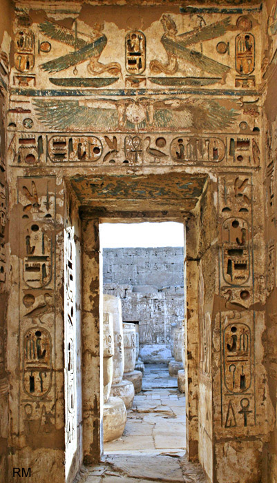 Revers de l'entrée de la chapelle 3 avec les titulatures de Ramsès III, la déesse vautour Ouadjet et 2 déesses Uraei, cobras étendant leurs ailes protectrices. les noms du roi sont accompagnés d'un signe qui signifie 'Le doré'.