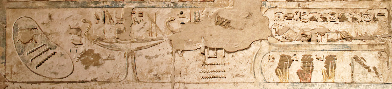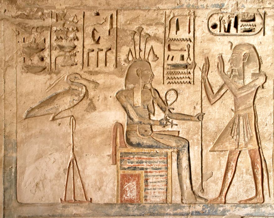 Le roi (à droite) adore le dieu Hapy. Derrière lui, l'oiseau Benou sur un pieu, évoque l'inondation et l'abondance des Champs d'Ialou. L'oiseau Benou, grand héron cendré, est à la fois le Ba de Rê et le Ba d'osiris. (Corteggaiani, page 82)