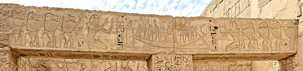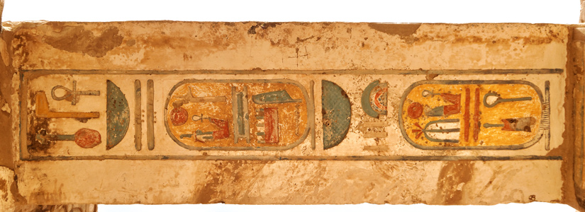 Sur ce dessous d'une partie de l'architrave, se lit une formule de louanges : "Vive le dieu accompli, le Maître des Deux-Terres, <Ouser-Maât-Rê, Mery-Amon> , le Maître des couronnes <Rê-Messou, Heka-Iounou>"