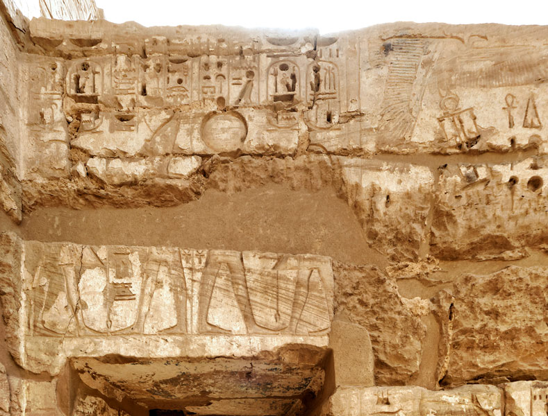 Paroi Est au dessus de la porte : unle roi fait des offrandes à Atoum àgauche et à Rê-Horakhty à droite.