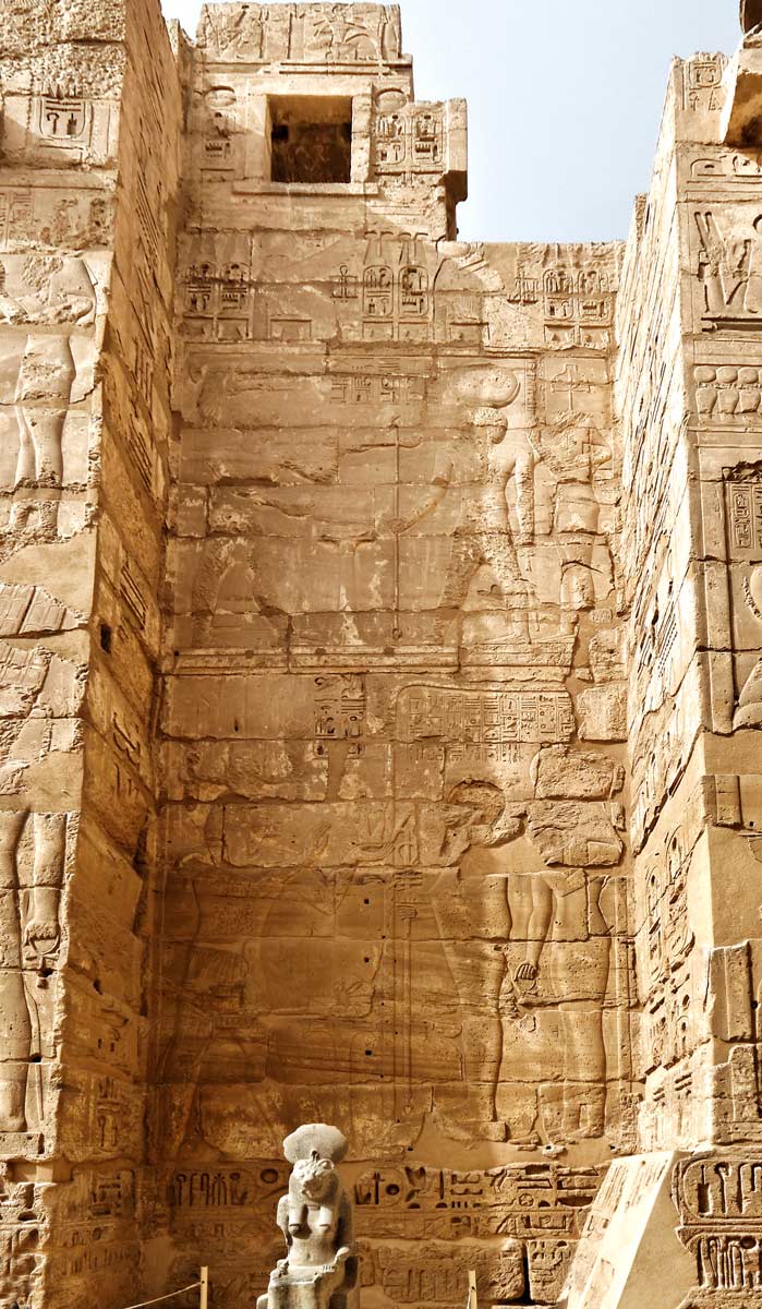 Devant le panneau, une statue de Sekhmet.