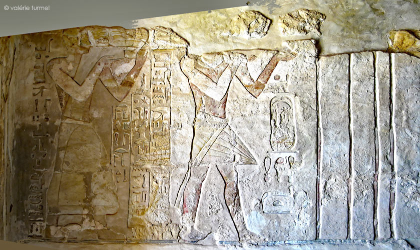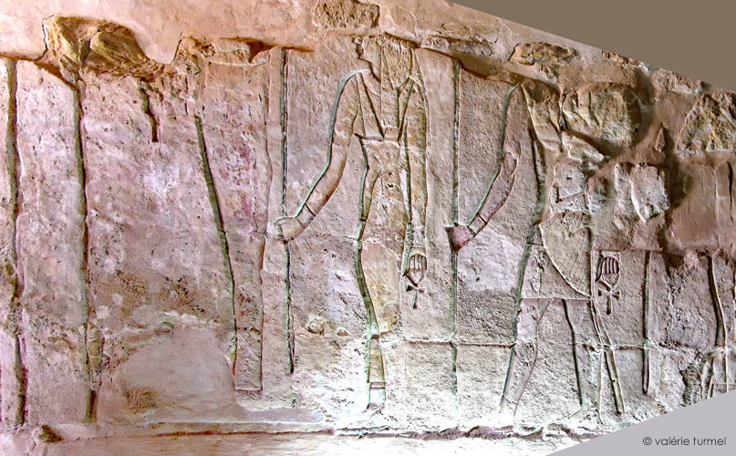 Devant les enseignes, six divinités reçoivent les offrandes . Seules les 2 premières sont représentées sur la vue.