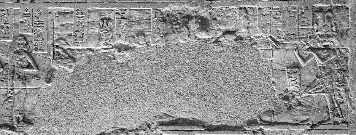 Sur le piédestal Osiris en bandelettes (11). Le dieu à tête d'ibis qui suit (12) est sans doute Thot portant des vases. Le même dieu est représenté ensuite (13) momifié sur une plateforme. Ensuite un dieu assis sur un trône portant un disque sur la tête (14).