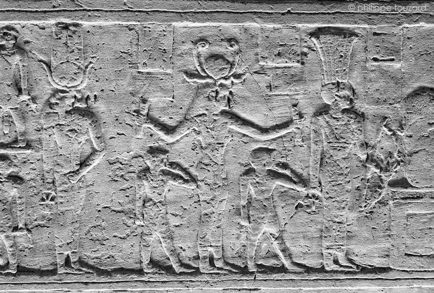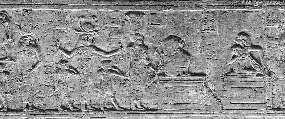 Une déesse se tient à genoux sur un piédestal allaitant un crocodile (10). Een 11, une déesse à tête de lionne sur un autel, Bastet. Ude représentation (12) de la déesse Ânouqis avec son arc et ses flèches qui réside à Dimay dans le Fayoum. Puis une déesse (13) portant l'emblème d'Hathor sur la tête et deux batons dans les mains. Elle est accompagnée par 2 garçons, probablement Horus et Ihy. Ensuite en 14, une autre déesse à tête de vache avec de grandes plumes et portant un papyrus, Hathor du sycomore.