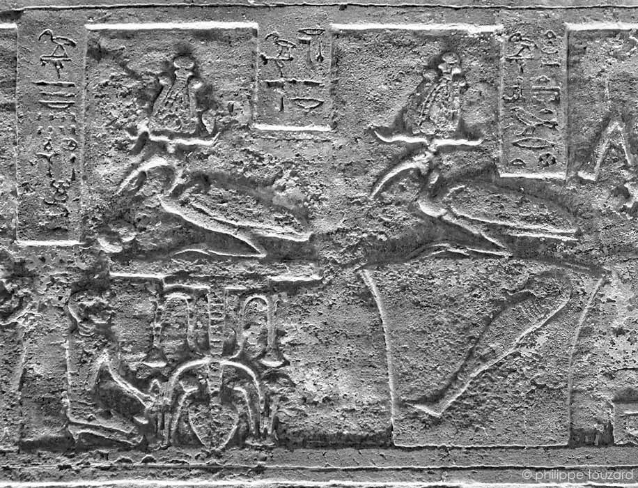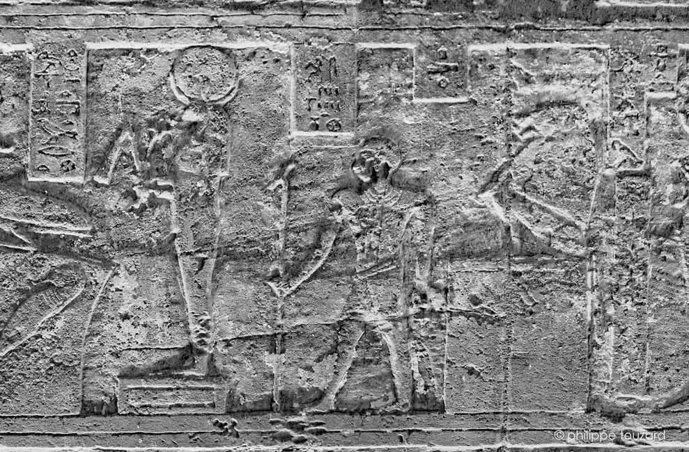 n°14.Un ibis couronnée se tient sur un Seama-Taouy, 'Thot doublement grand, seigneur d'Hermopolis, grand dieu, qui s'est fait seul'. Un homme agenouillé tient le signe de l'union de l' Égypte.