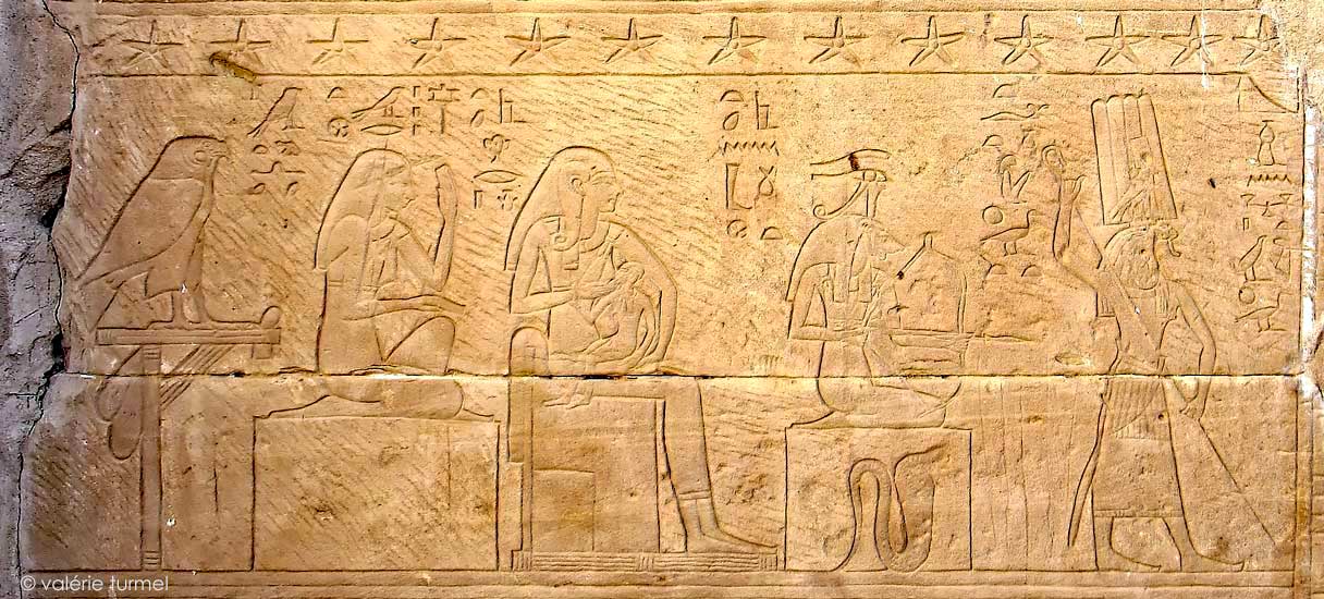 Isis de Coptos, agenouillée, allaite le jeune roi.